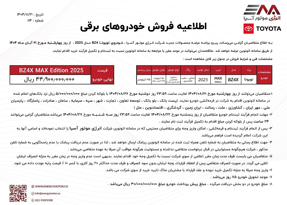 مرحله جدید فروش محصولات انرژی موتور آسیا، ویژه متقاضیان ثبتنام تویوتا BZ4X وارداتی، از روز پنجشنبه ۲۲ آبان ۱۴۰۴ آغاز شده و تا پایان سهشنبه ۲۷ آبان ۱۴۰۴ ادامه خواهد داشت.