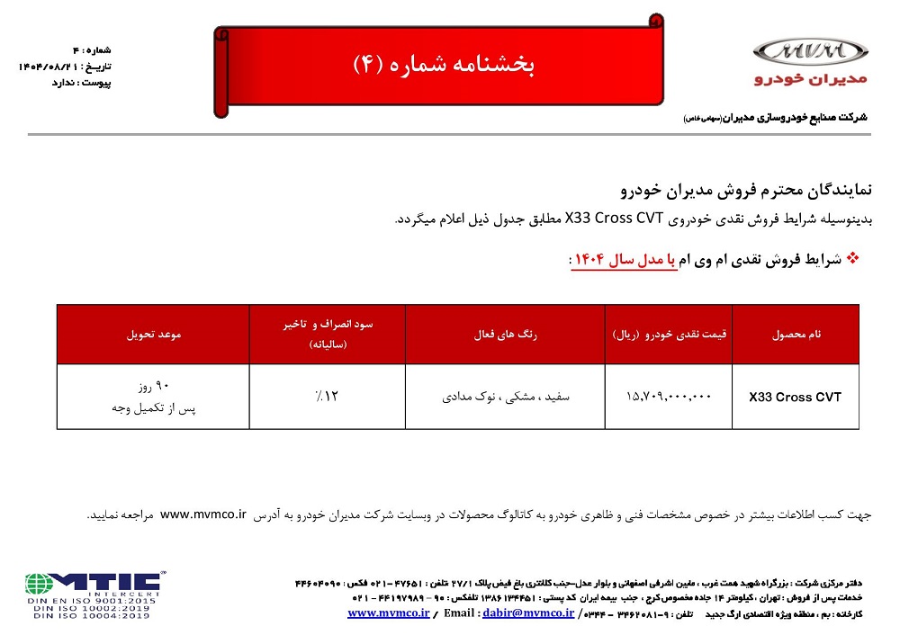 شرایط فروش امویام ویژه آبانماه 1404 برای متقاضیان ثبتنام X33 کراس اعلام شد.