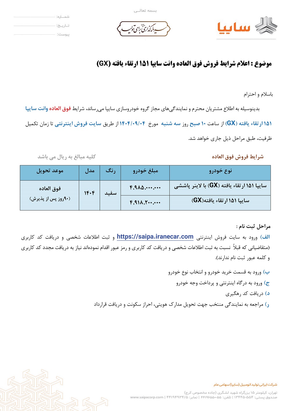 ثبتنام وانت ارتقایافته سایپا در دو تیپ مختلف (با لاینر و بدون لاینر) از روز سهشنبه، ۴ آذر ۱۴۰۴، ساعت ۱۰ صبح آغاز شده و تا تکمیل ظرفیت ادامه خواهد داشت.
