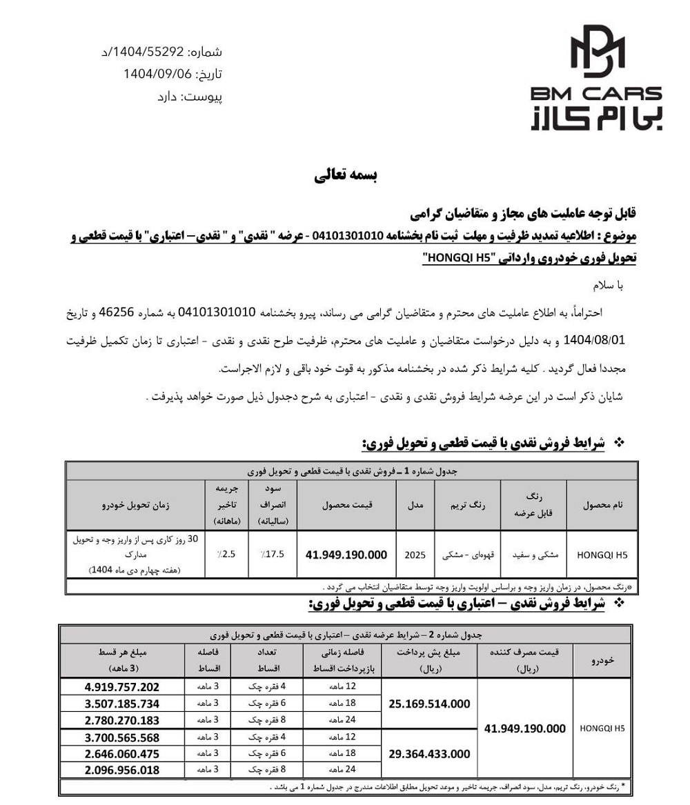 شرکت بهمن‌موتور اعلام کرد که طرح فروش نقدی و اعتباری هونگچی H5، که از آبان 1404 آغاز شده بود، به دلیل تکمیل‌نشدن ظرفیت، مجدداً از روز شنبه 8 آذر 1404 در نمایندگی‌های این شرکت فعال خواهد شد.