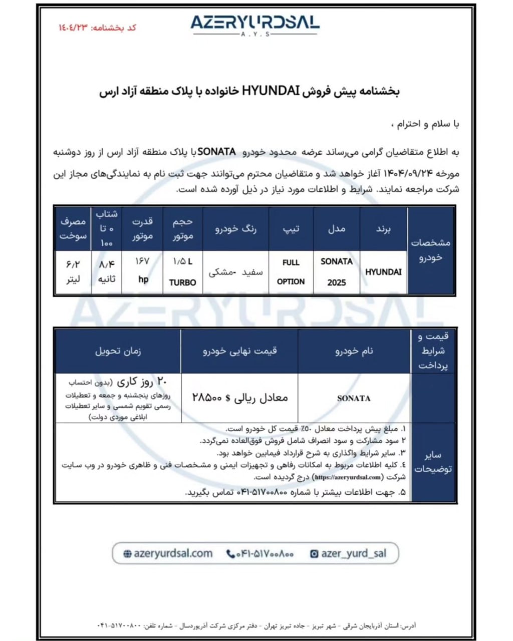 شرکت آذریوردسال شرایط فروش ویژه هیوندای سوناتا توربو مدل 2025 وارداتی (با پلاک منطقه آزاد ارس) را اعلام کرد. ثبت نام از روز دوشنبه 1404/09/24 آغاز شده و تا تکمیل ظرفیت ادامه خواهد داشت.