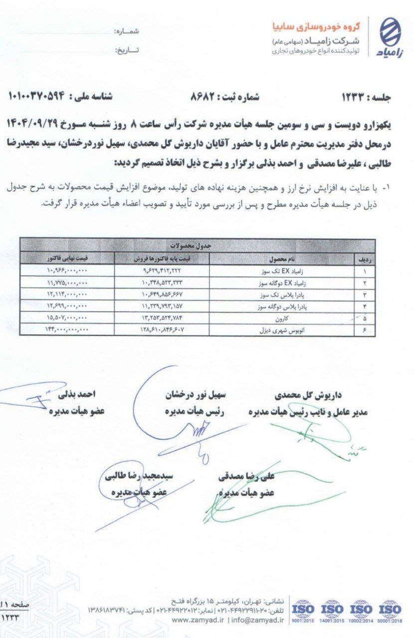 افزایش قیمت وانتهای زامیاد از ۲۹ آذر ۱۴۰۴