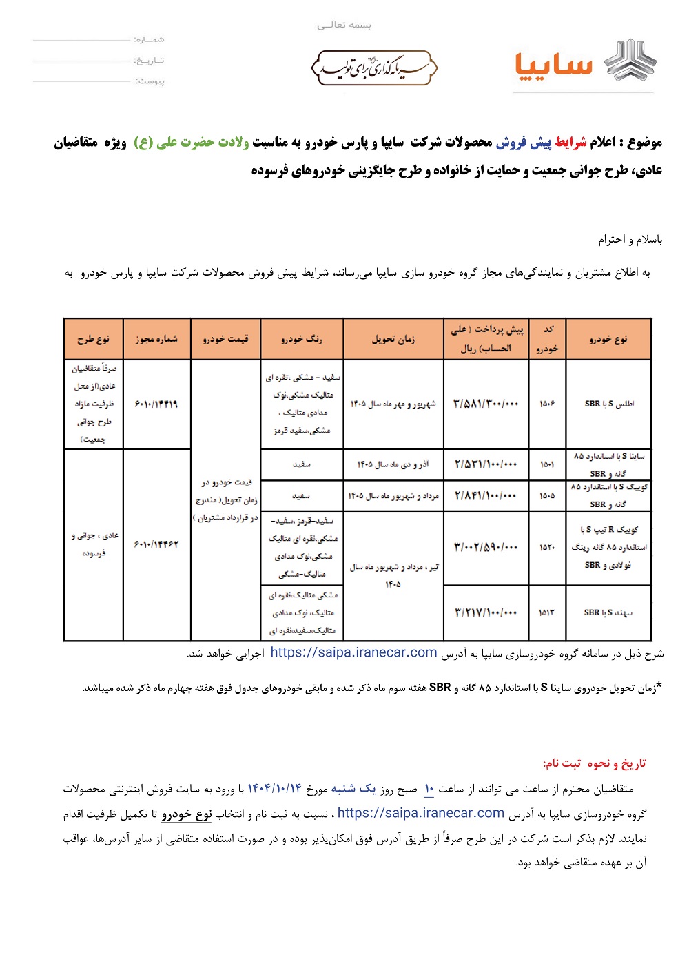 پیشفروش اینترنتی محصولات سایپا از ساعت ۱۰ صبح روز یکشنبه ۱۴ دی ۱۴۰۴ آغاز شده و تا زمان تکمیل ظرفیت ادامه خواهد داشت.