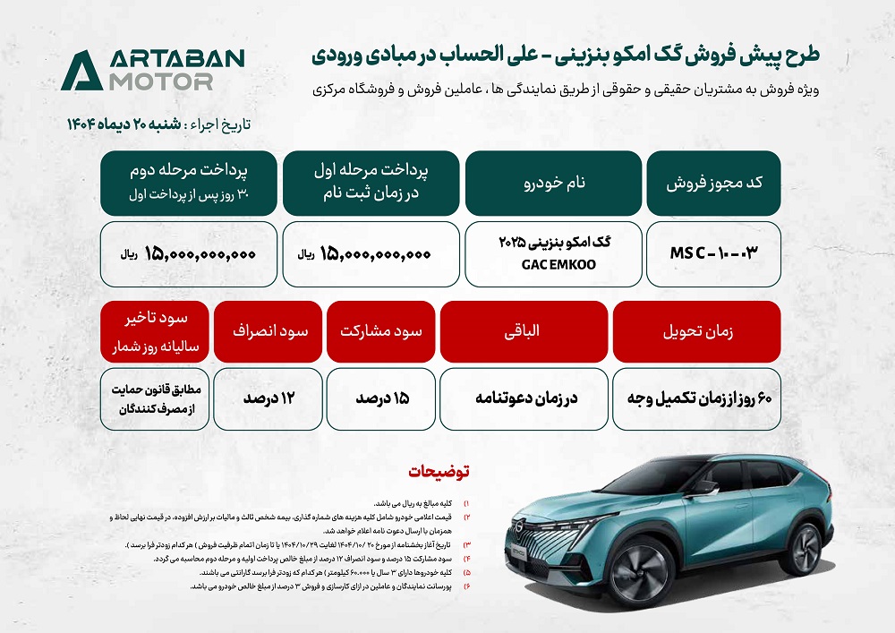 شرایط پیش‌فروش جی‌ای‌سی ویژه متقاضیان ثبت‌نام گک امکو بنزینی از شنبه ۲۰ دی ۱۴۰۴ آغاز و تا دوشنبه ۲۹ دی ۱۴۰۴ ادامه خواهد داشت.